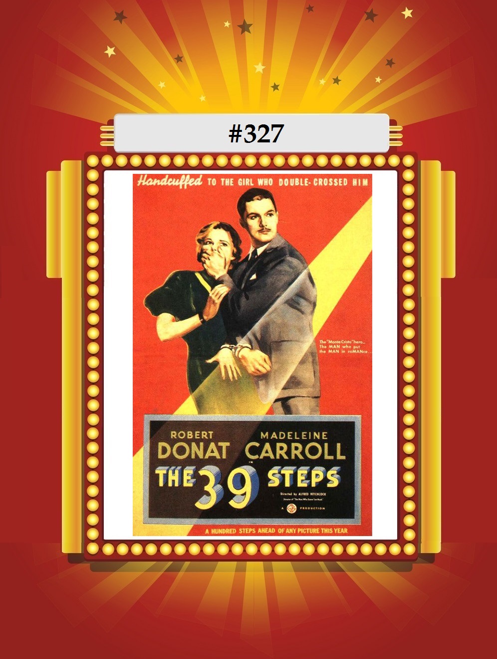 As I said in #370 Notorious, I’m not a huge Hitchcock guy, but his espionage thrillers still resonate with me. Sure, the proceedings probably aren’t given the proper gravity by Donat’s everyman Hannay, thus making it an easier tale to transform into straight comedy than, say, Notorious would’ve been (again, they did manage to make adapt movie into a stirring rap biopic though – see #329 Notorious). But the story still has enough twists and atmospheric moor-ish settings to fill the lean 86 minutes.