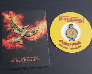 Hunger Games and Bob’s Burgers pins, from some remote Loot Crate