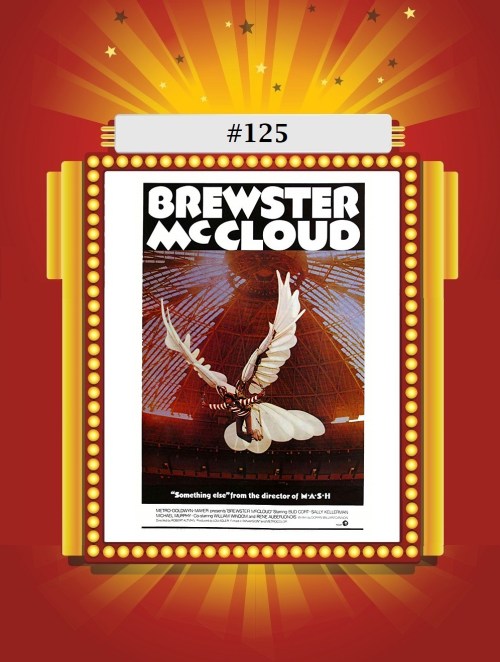 In going through a big tear of Robert Altman movies a few years ago – upon realizing that while I’d seen his most acclaimed movies, he made a ton of other films ranging from well regarded to strongly recommended curiosities – I finally tracked down a copy of what I remembered vividly from video stores when I was a kid. I always confused the title with a western – I’m guessing John Wayne’s McLintock or the Dennis Weaver TV show McCloud – but the tape cover was as above – this kid flying inside a dome, and it always stuck with me. And so began my love affair with the wholly original – even inside the Altman canon – Brewster McCloud.